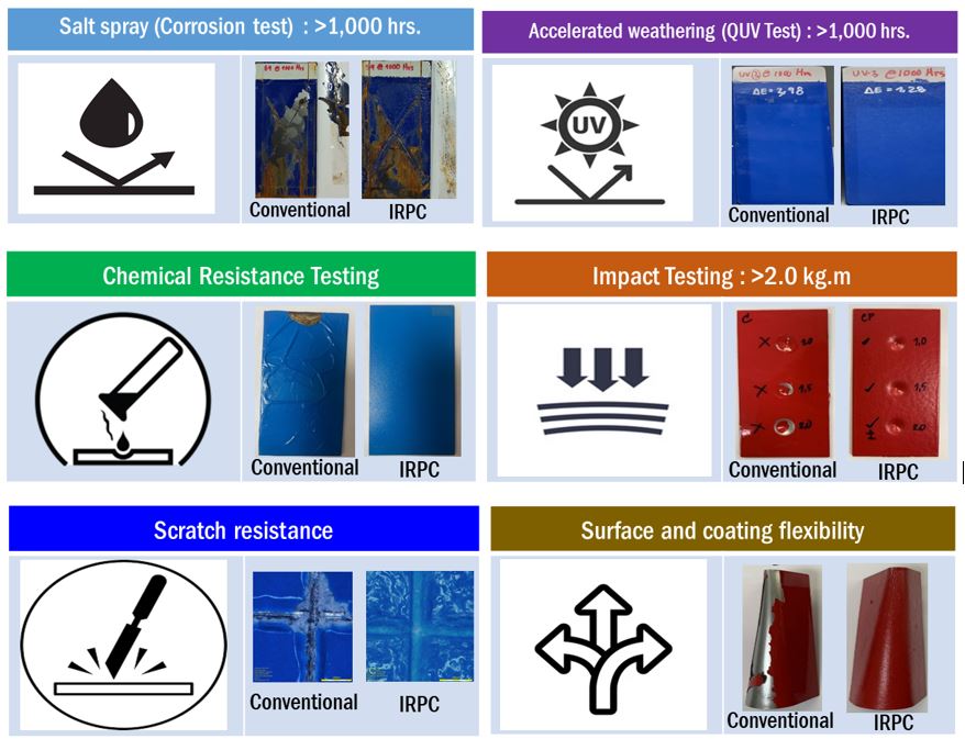 In response to these challenges, IRPC Public Company Limited has developed advanced products to effectively address these pain points. Utilizing technology based on the company's Anti-Dripping additive—a polymer additive developed with nanotechnology that prevents polymer dripping upon ignition—IRPC has created a solution with optimal dispersibility in polymers. When applied to heavy industrial and marine paints, this innovation yields a product with superior resistance to weathering and seawater corrosion for over 1,000 hours, as well as robust resistance to both acidic and alkaline environments. Furthermore, it withstands abrasion and impact stresses exceeding 2 kilograms per cubic meter. This development significantly enhances the durability and performance of heavy industrial and marine paints, positioning IRPC’s products as comparable to or exceeding the quality of leading products on the market.